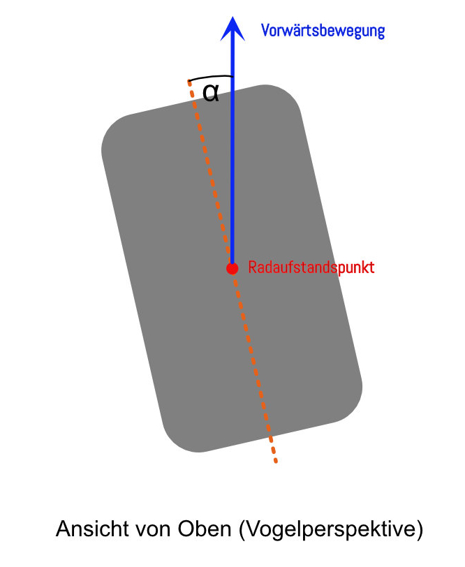 Hier eine kleine Grafik zum verdeutlichen, was der Schräglaufwinkel ist, der hier mit α gekennzeichnet ist. Grau ist der Reifen und der blaue Pfeil ist der Vektor der Vorwärtsbewegung. Die Einstellung dazu bei Assetto Corsa Competizione ist die Spur oder auch TOE genannt. Dazu gibt es auch ein gesonderter Abhandlung unter Spur.